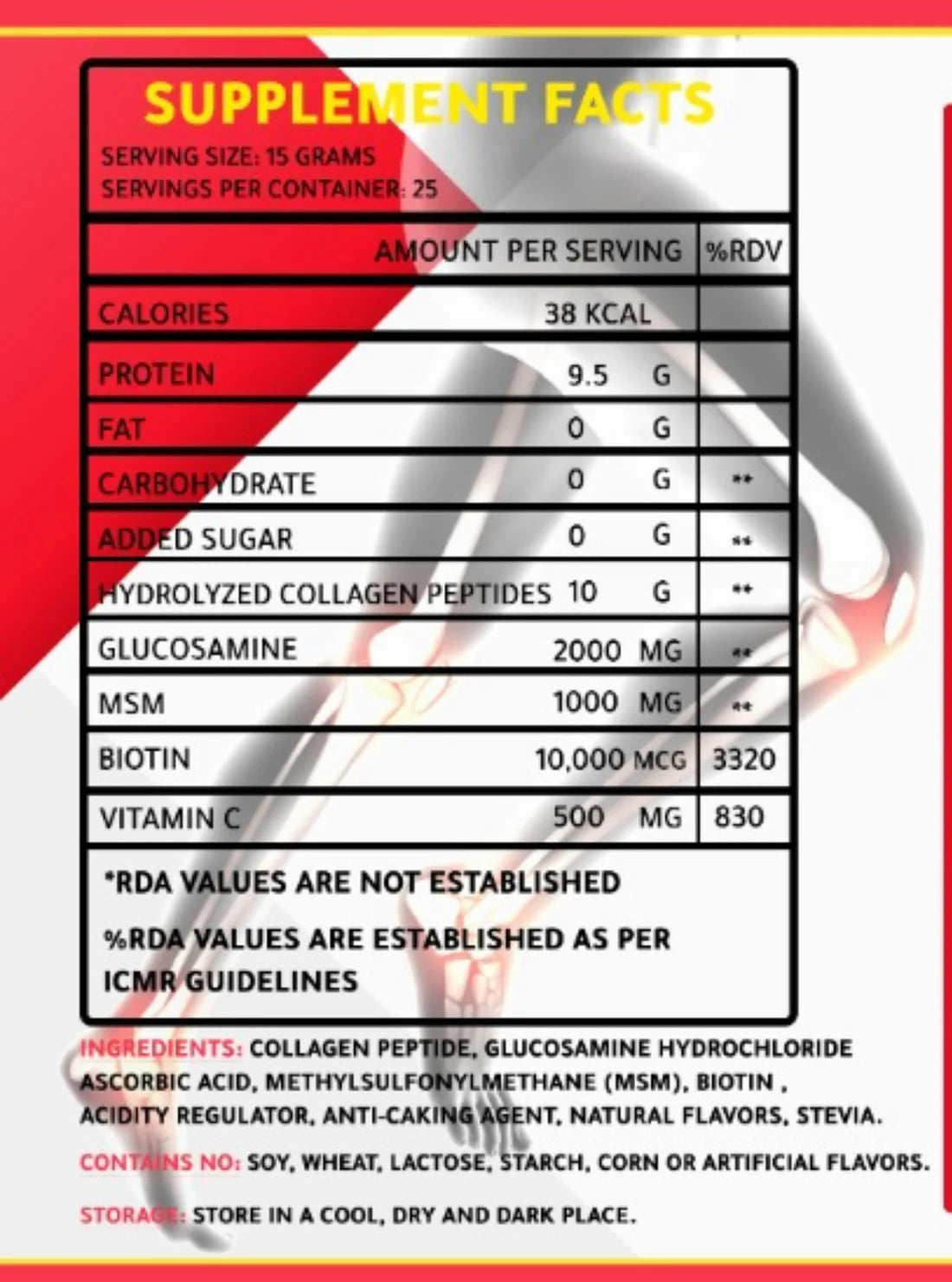 تركيبة قوية ومتطورة من هيدرولايزد كولاجين بيبتيد بتركيز 10 جم، مدعومة بـ جلوكوزامين، MSM، بيوتين، وفيتامين C، لمفعول شامل يعزز صحة المفاصل، ويجدد شباب البشرة، ويقوي الشعر والأظافر. منتج مثالي للرياضيين أو أي شخص مهتم بصحة جسمه ومظهره من الداخل والخارج.
