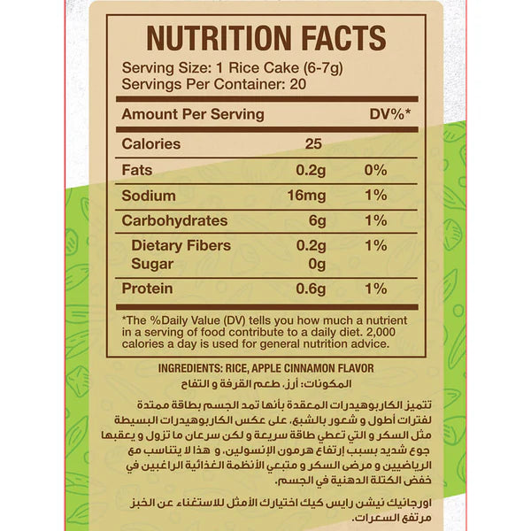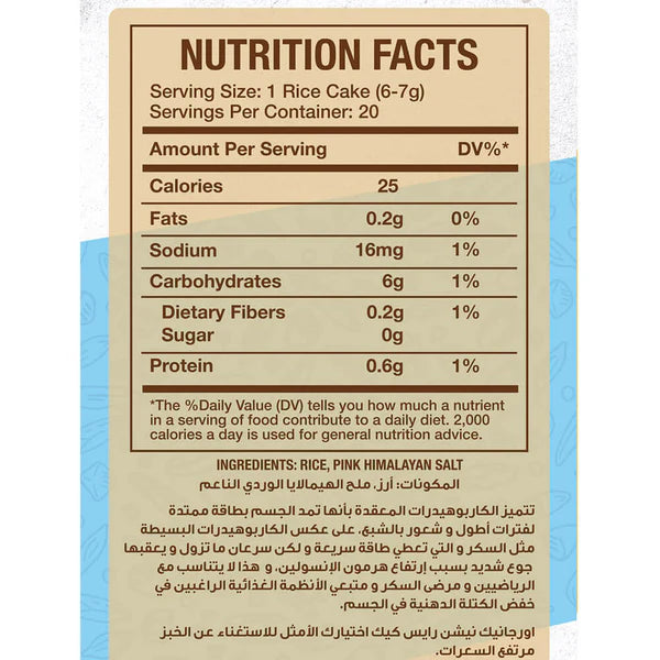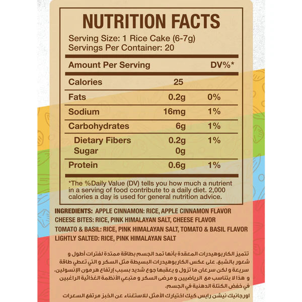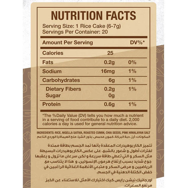 رايس كيك هو الخيار المثالي للباحثين عن وجبة خفيفة منخفضة السعرات ولكن غنية بالإحساس بالشبع. يتميز رايس كيك بأنه خفيف جداً على المعدة وسعراته قليلة جداً، مما يجعله مثالياً لأي نظام غذائي سواء كان هدفك التنشيف أو الحفاظ على الوزن.